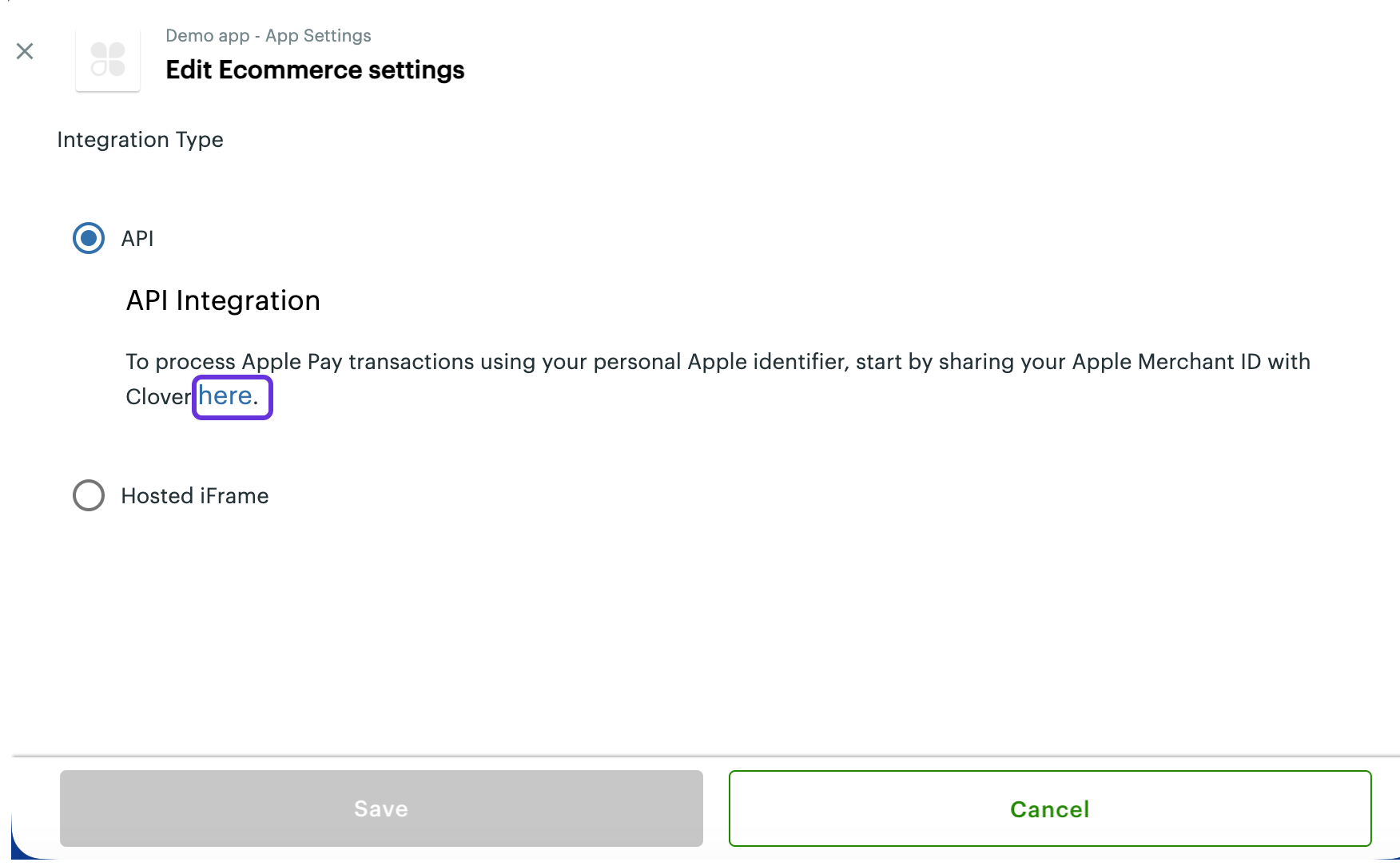 Clover Merchant Dashboard: Ecommerce Payments page > Apple Pay section > API Integration