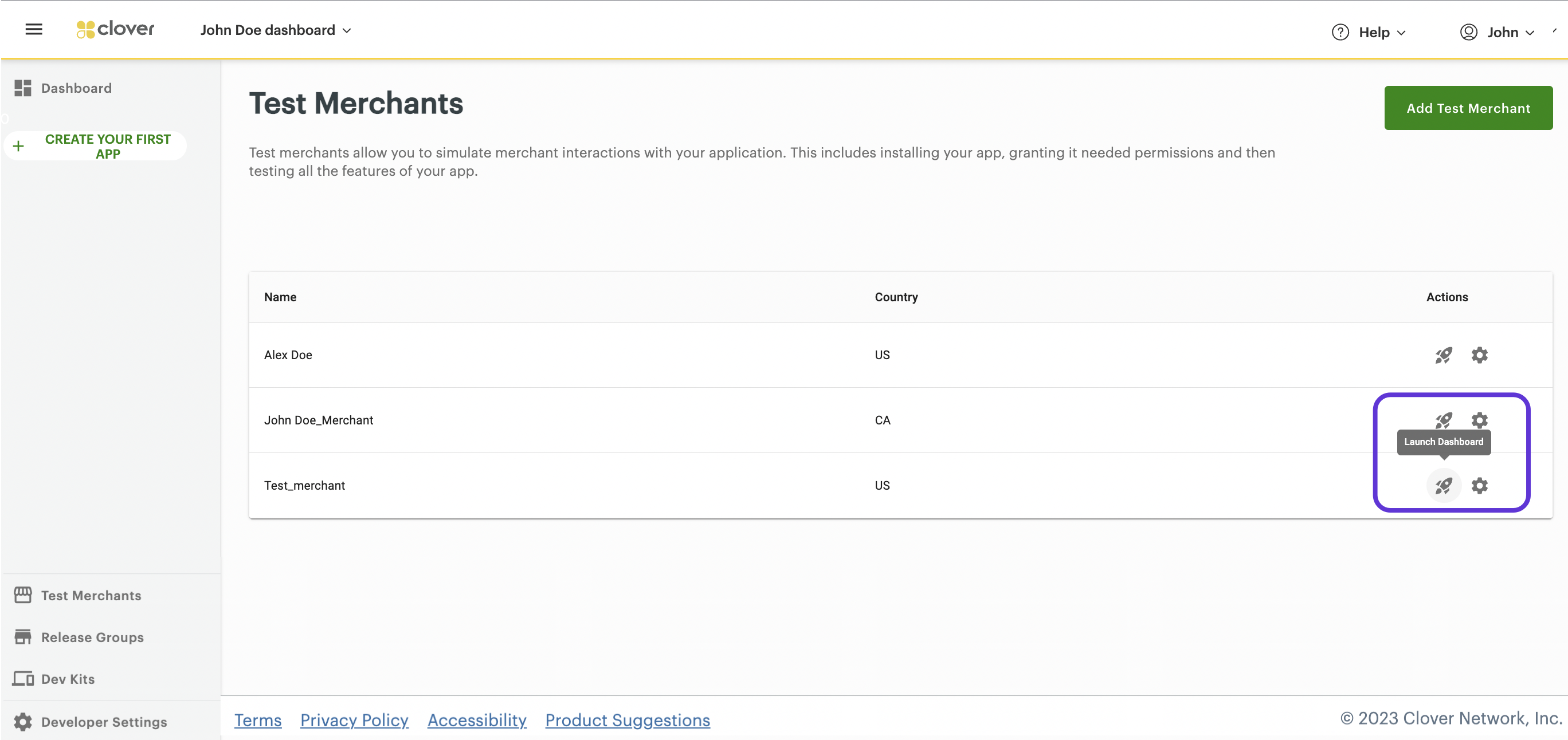 Test merchant accounts let you simulate merchant interactions with your application. This includes installing your app, assigning permissions, and then testing all the features of your app. When you sign up to create your sandbox developer account, you can create a test merchant after entering your developer and account information.